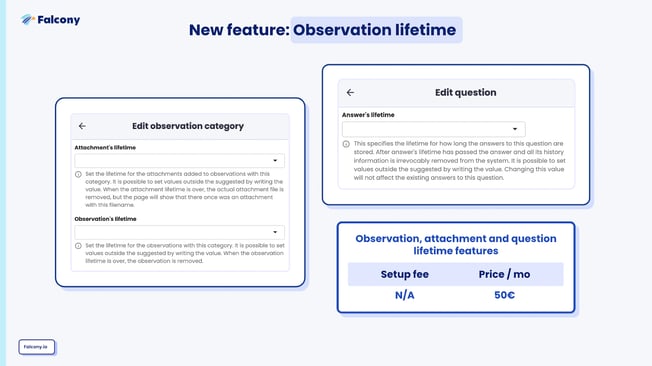 Again, let’s start with what we’ve already had in the past. With observations, it has been possible to auto-delete attachments of certain chosen categories and also auto-delete answers of certain observation questions. And of course it’s not just the auto-delete, but the lifetime of those, so how long will it take for Falcony to auto-delete them.