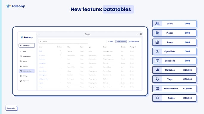 In the past we have had multiple ways to show table-like data but many of the lists, like places, questions and roles were missing filtering and column pickers. The new datatables unify how the lists look and feel but even more than that, they will be much faster than before and allow for more information to be shown and used in the tables.