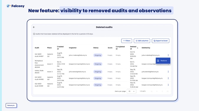 Instead of being able to only look at the deleted items on a list, customers can filter the list, decide which columns to show on the list, sort all those columns as they want and last but not least, restore any of those observations and audits whenever they want.